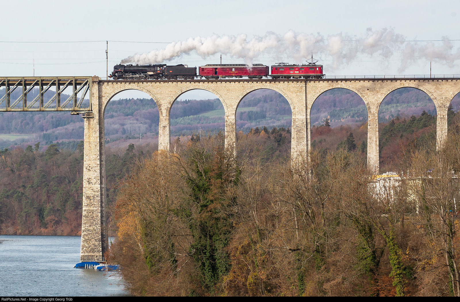 | Transfer run of the Baldwin built former French Railways "Mikado" 141 R # 568 with her tools and staff car (a former french postal car) and Re 4/4 I # 10009. The privately owned steamlocomotive, pictured on the Rhine viaduct near Eglisau, run from the previous base in a shed in Schaffhouse to her new home in Vallorbe (Swiss-France border station). |