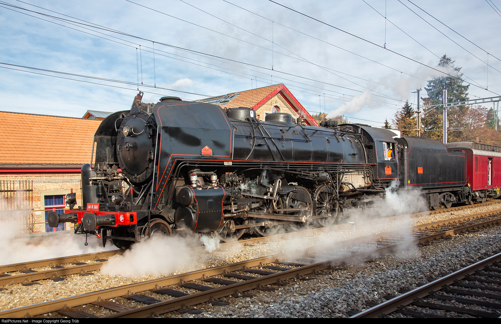 | Transfer run of the Baldwin built former French Railways "Mikado" 141 R # 568 with her tools and staff car (a former french postal car) and Re 4/4 I # 10009. The privately owned steamlocomotive run from the previous base in a shed in Schaffhouse to her new home in Vallorbe (Swiss-France border station) this day. |