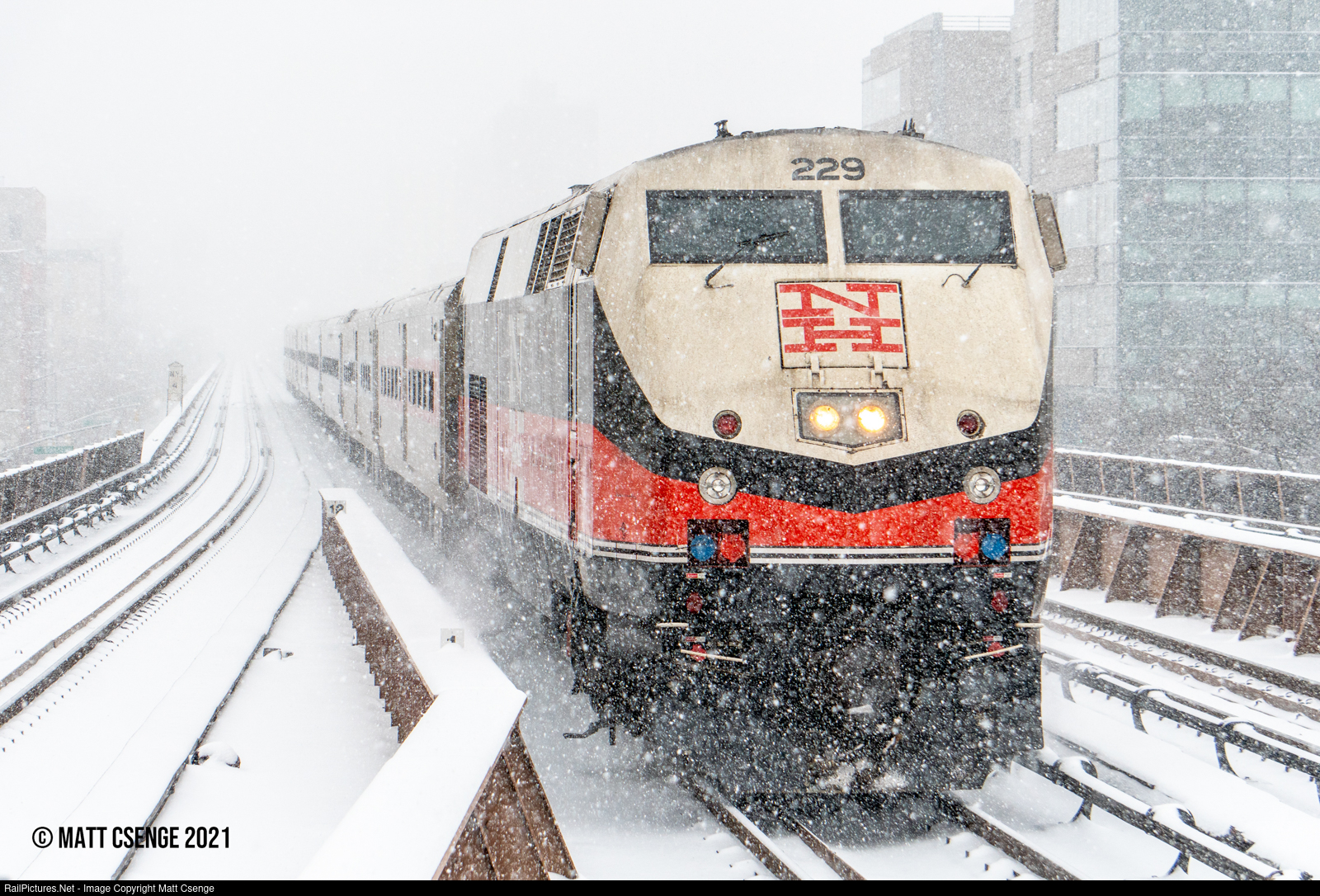 Off-White. Metro-North P32AC-DM no. 229 (GE Genesis, 1992-2001), one of the New Haven heritage units, charges up the Park Avenue Viaduct approaching Harlem-125th St Station during yet another February snowstorm. The fresh, white snow shows just how dirty the locomotive is!
