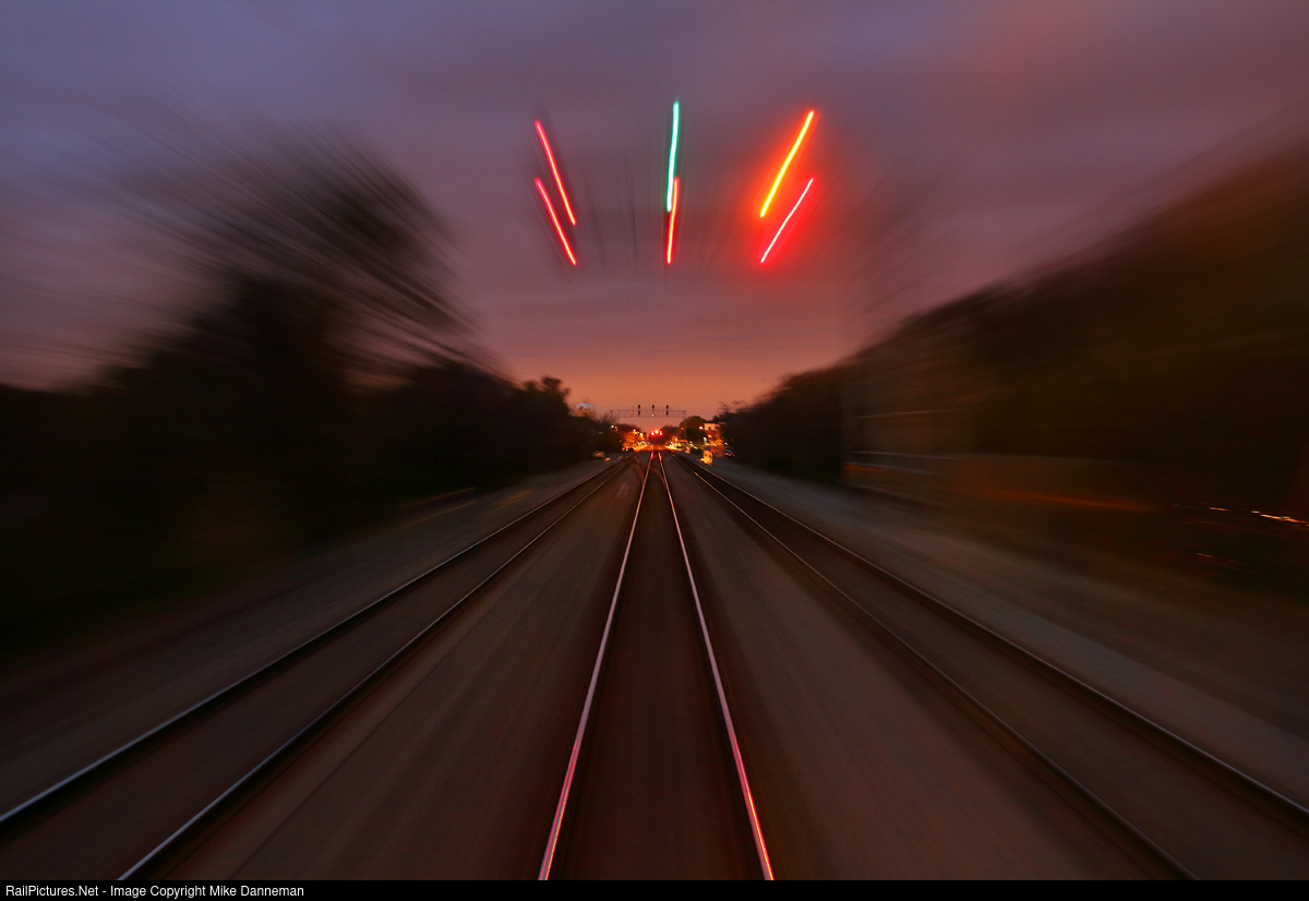 Warm colors of dawn are breaking on the eastern horizon as a Metra commuter train rushes toward Chicago on a high green over Track 2 at Naperville, Illinois, on November 9, 2017. The view is through the door window on the lower level of a bi-level cab car in a 2.5 second exposure.