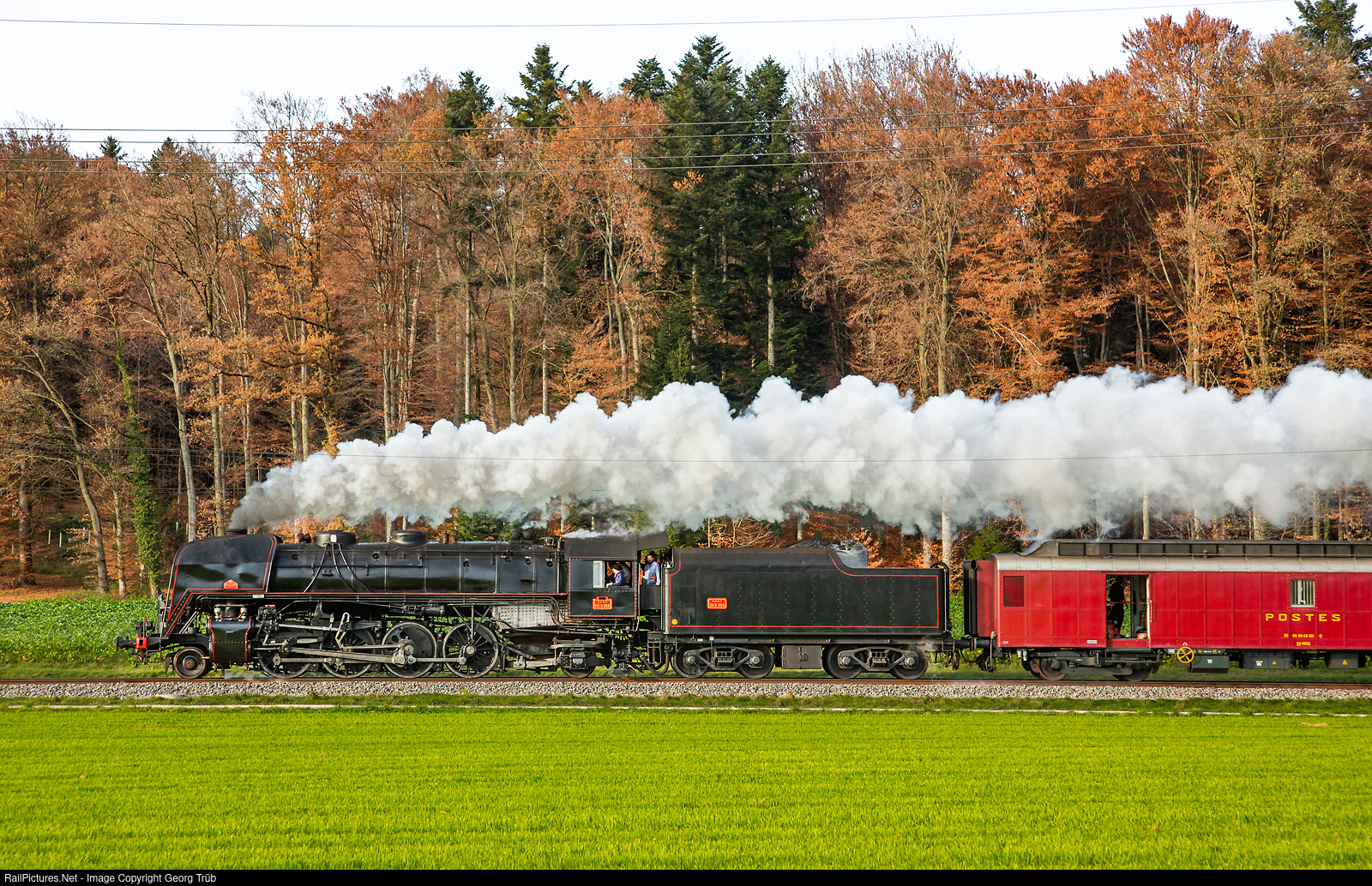 | Transfer run of the Baldwin built, former French Railways, coalfired "Mikado" 141 R # 568 with her tools and staff car (a former french mail car) and Re 4/4 I # 10009. The privately owned steamlocomotive run from the previous base in a shed in Schaffhouse to her new home in Vallorbe (Swiss-France border station) this day. The train is running full steam between Lyssach and Hindelbank. |