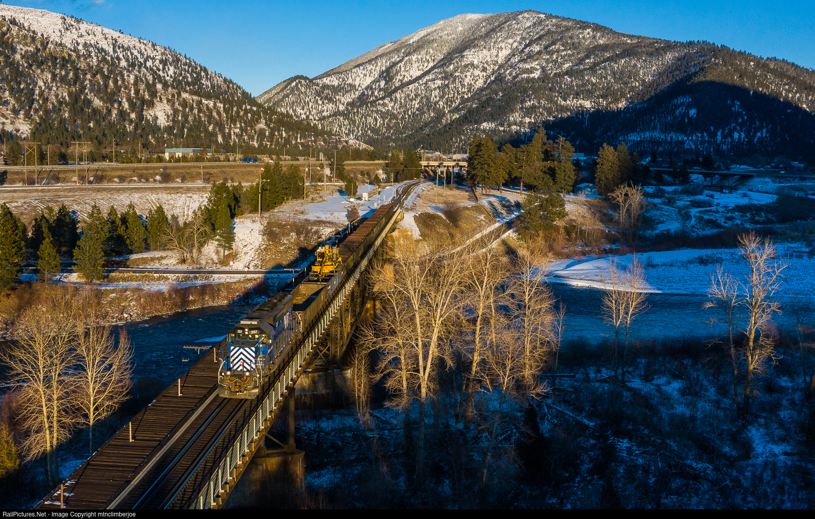 After completing a perfectly synchronized meet with the eastbound local to Bonner, MRL SD40-2XR 252 leads the Montana Rail Link Jimbo Train as it heads west across the Clark Fork River, catching the last rays of sun in Milltown, Montana outside of Missoula. The train will tie down in Missoula for the night before heading out the next day to drop ties for summer track work.