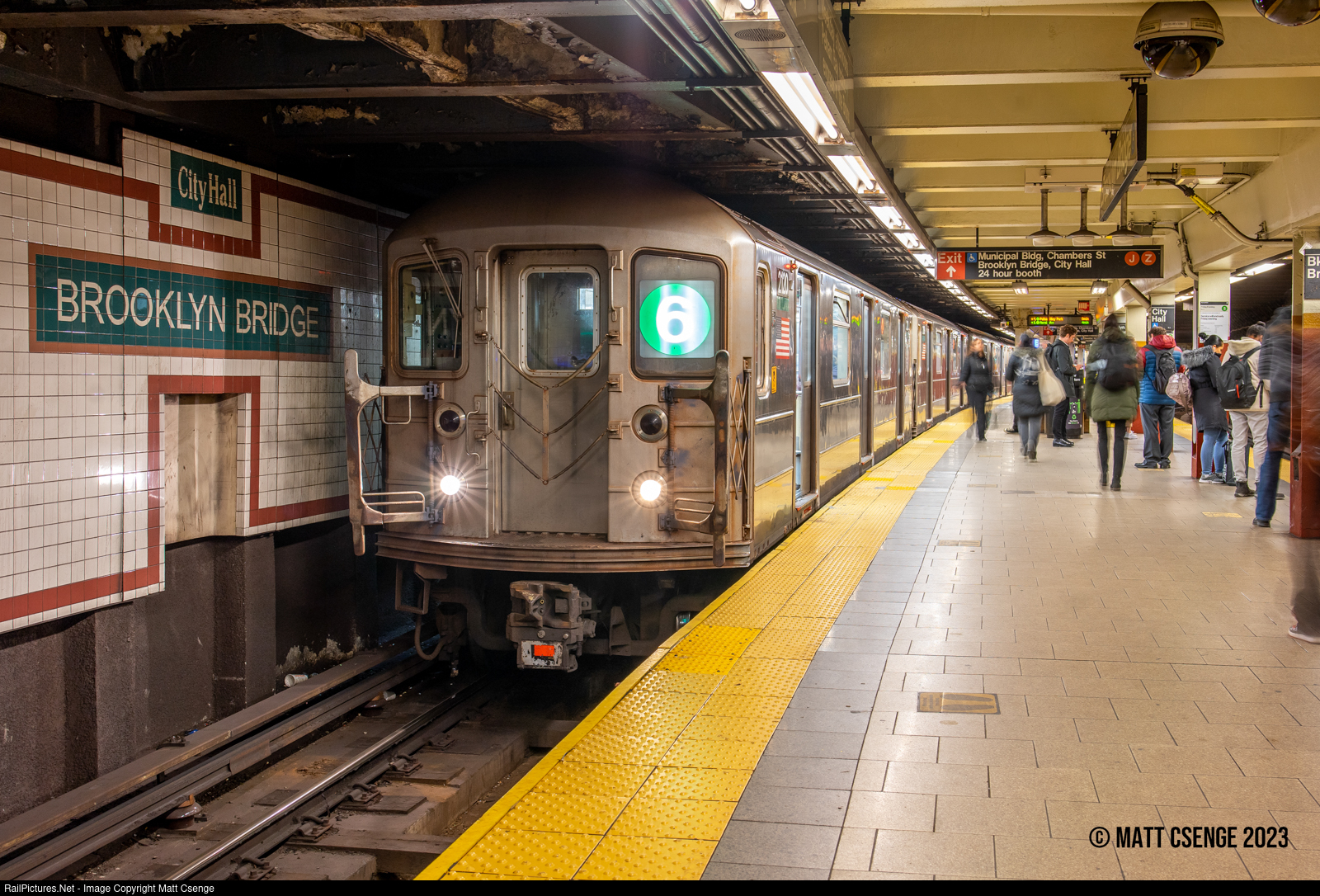 New York City Transit Authority (NYCTA) R62A no. 2120 (Bombardier, 1984-1987) is the lead motor on a Bronx-bound 6 train seen entering service at Brooklyn Bridge-City Hall Station on the IRT Lexington Avenue Line.