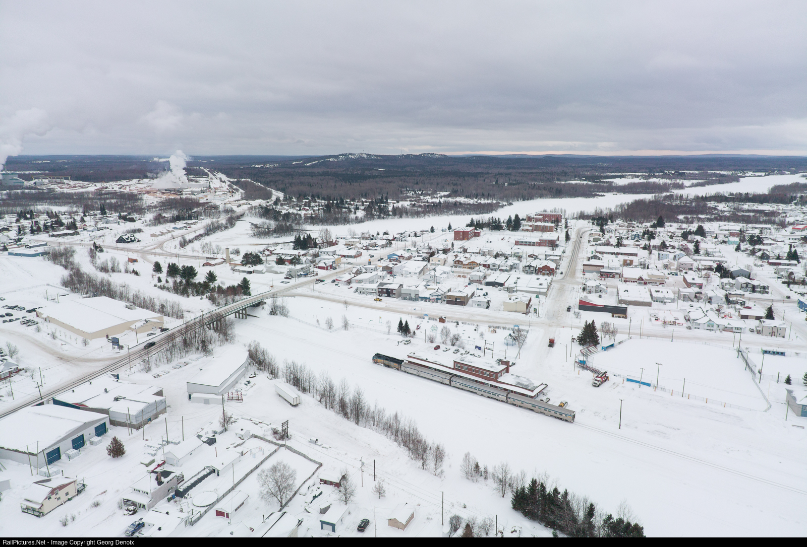 | Overlooking the South-Eastern part of Senneterre, VIA Rail's Abitibi no. 606 is boarding frieght and passengers for the Sunday-morning departure of the 440 mile journey to Montreal. |
