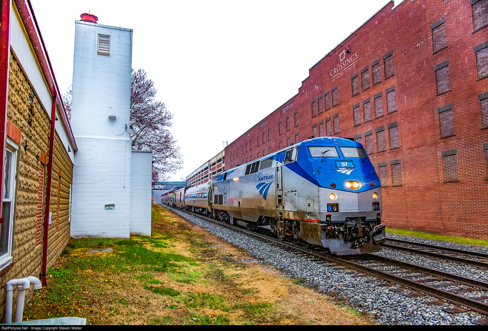 Amtrak 29 slips between some buildings in downtown Gaithersburg on a gloomy day, squeezing between an old fire station and a large apartment complex built a few years ago. The building on the left is the former Gaithersburg-Washington Grove Volunteer fire station which was in operation from the 1930s until 1978 when the department moved to its current firehouse on Montgomery Village Avenue. It is now a museum housing many fire department relics.