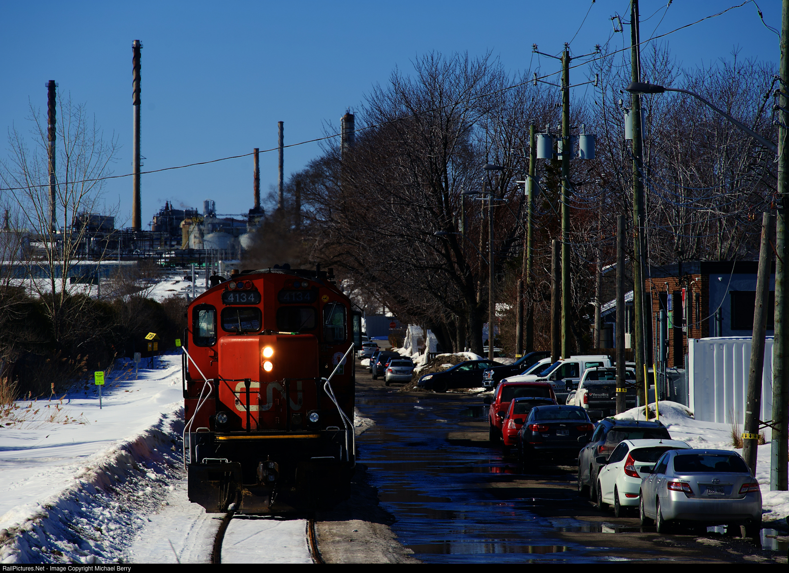 The Montreal East Switcher is heading light power to pick up empties at Bitumar. This spur closely parallels a residential street.