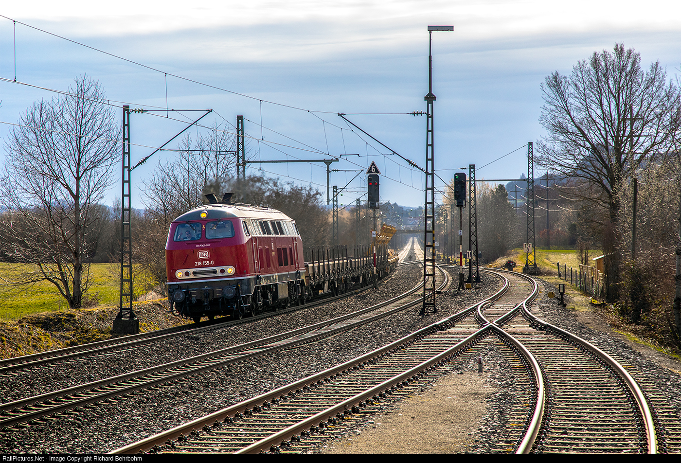 | The former Deutsche Bundesbahn locomotive 218 155, today owned and operated by NeSA (Eisenbahn-Betriebsgesellschaft Neckar-Schwarzwald-Alb mbH) is en route with empty freight cars from Schaffhausen to Oberhausen. |