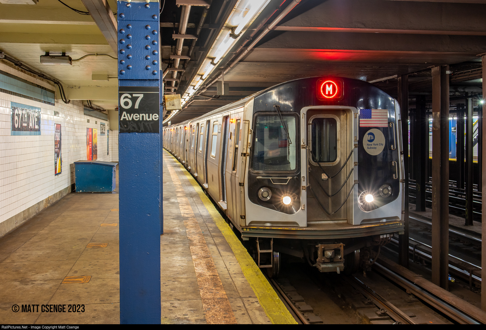 New York City Transit Authority (NYCTA) R160A no. 8512 (Alstom, 2005-2010) is the lead motor on a Forest Hills-bound M train seen stopped at 67th Ave Station on the IND Queens Boulevard Line.