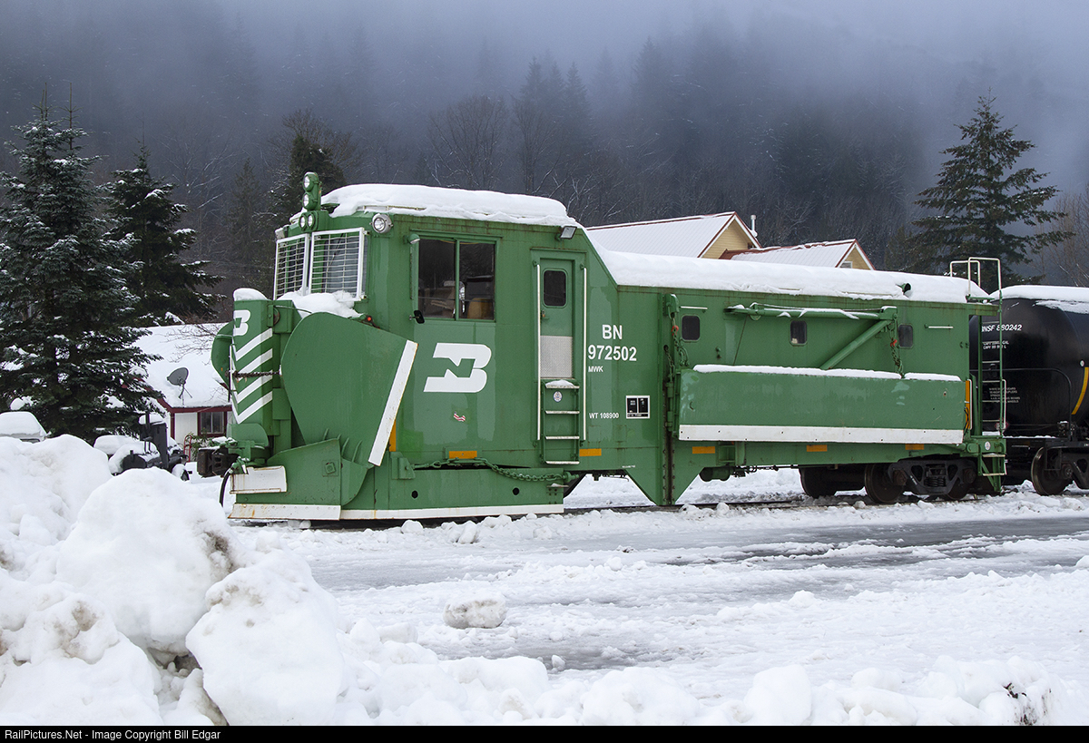 | BN 972500 sits in Skykomish, WA awaiting the next call to clear snow on BNSF's Stevens Pass mainline. Snow volume and traffic density will determine if the machine will be called to duty. This unit dates back to Great Northern. A similar plow is stored at Appleyard in Wenatchee to attack snow issues from the east side of the Pass. |