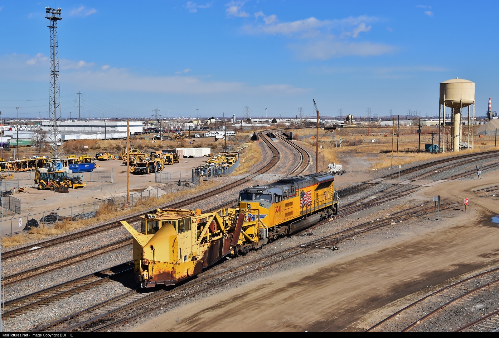 | The Union Pacific pull a Denver & Rio Grande Western Jordan Spreader through the North Yard in Denver, Colorado, passing the old Colorado and Southern water tank from the steam era days.