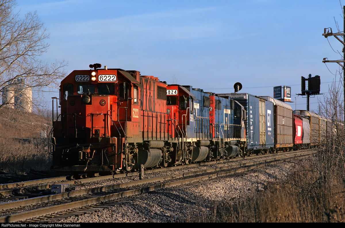 EMD GP38-2 No. 6222, still decorated in the orange paint scheme of Detroit, Toledo & Ironton, is now working for Grand Trunk Western after a merger and leads a GTW freight train on February 7, 1987. The train is operating northbound on Indiana Harbor Belt and is approaching the busy crossing of Santa Fe’s main line at McCook, Illinois.