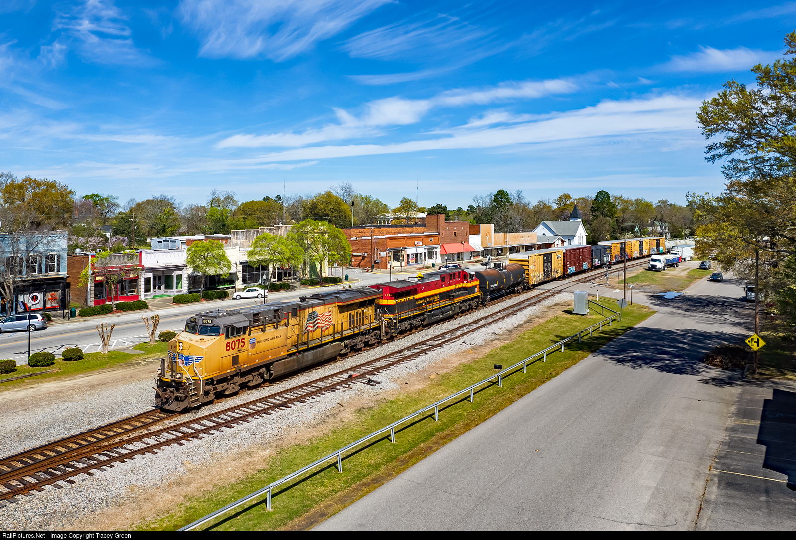Daylight Run. Typically, 191 of recent has been a nighttime run south on the Southern's R Line but, on this day, while actually scouting for something else, I caught it leaving Columbia, SC in the early morning and decided to chase it to Augusta, GA. The R Line south of Columbia has some very beautiful scenery and runs through some quaint towns. Here, led by completely foreign power, including a KCS de Mexico unit, 191 passes through Johnston, SC, which along with the Upstate of South Carolina produces the bulk of South Carolina grown peaches.