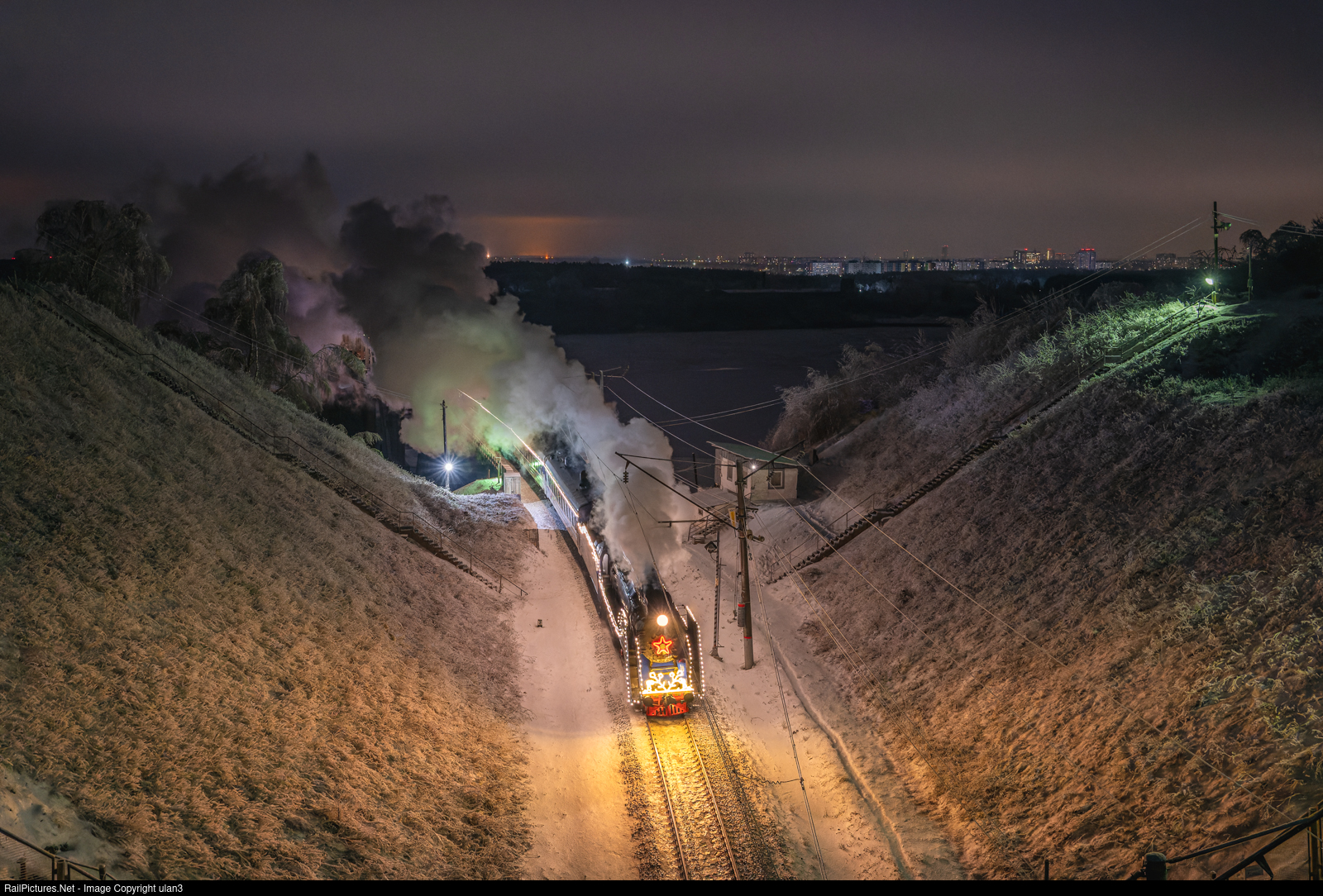 The old soviet steam locomotive P36-0218 is leading a Santa-Claus train.