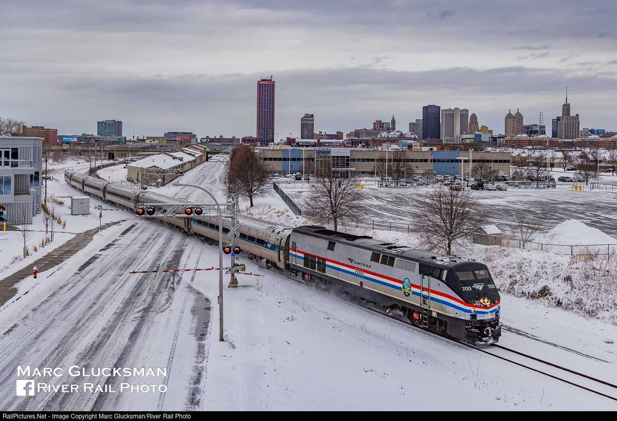 Snowy Buffalo. Shortly after departing the stop at Exchange Street on March 12, 2022, Amtrak Train 284 kicks up the snows of the previous days and crosses the street of the same name name with class unit AMTK 700 (P32DC, Phase III) leading. The skyline of Buffalo, New York rises in the background with the sun to follow later as the train heads towards New York Penn Station.