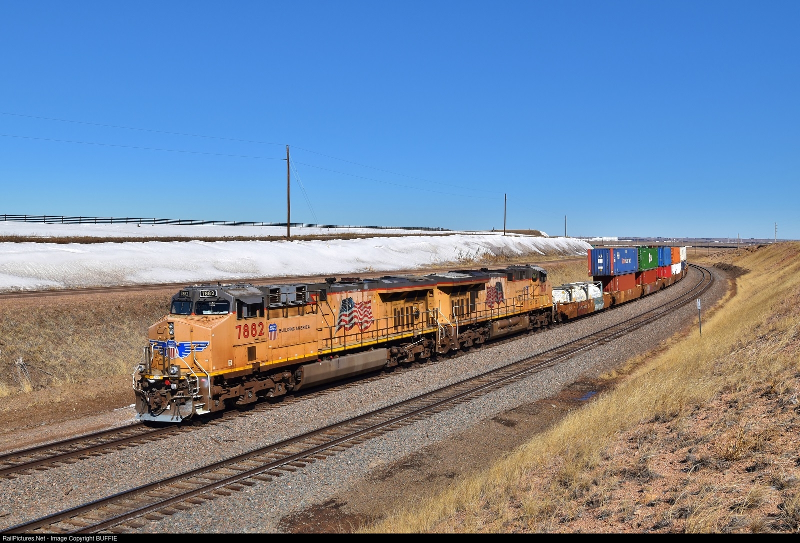 | UP 7882 (AC45CCTE) holds a freight at Speer, Wyoming until word comes that the line has been cleared of snow drifts.