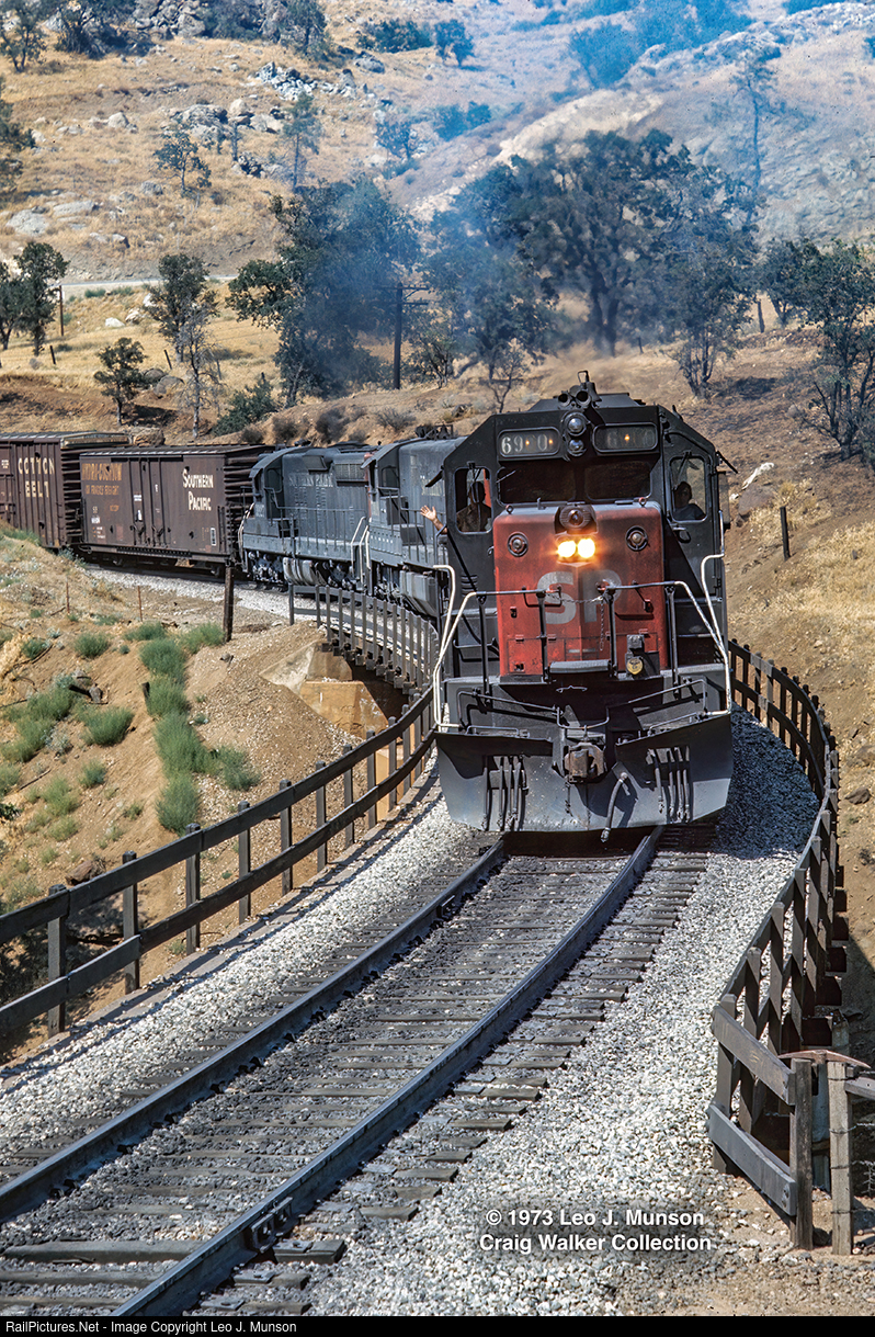 Crossing Tehachapi Creek between Woodford and Walong, the engineer of an eastbound Southern Pacific freight gives a friendly wave as the train climbs over the Tehachapi Mountains, with a typically eclectic Espee consist: SD35 6900 (ex-4816) leading U30C 7918 and SD9 3927 (ex-5453). (Tehachapi Mountains, California – August 1973). Leo J. Munson photograph, Craig Walker Collection
