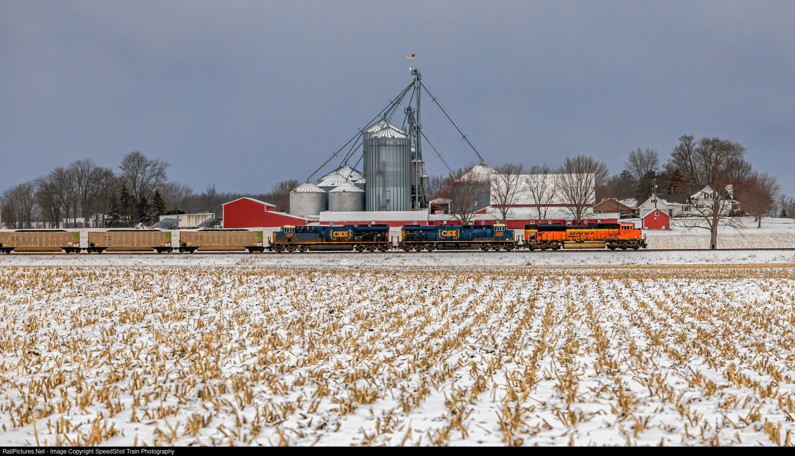 | C801-12 Loaded Coal train to West Olive - Passing the farm at 140th ave Holland Michigan, with BNSF 9170 Leading 129 coal cars (2 CSX Helpers) and a rear BNSF DPU. The West olive Coal plant will be closing to coal use in 2025 and moving to natural gas |