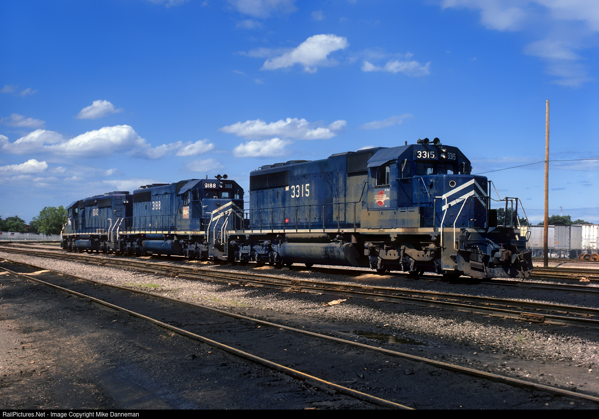 | A trio of dirty Missouri Pacific EMD SD40-2s sit at the locomotive facility in Yard Center at Dolton, Illinois, on August 10, 1986. |