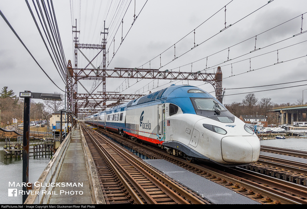 Acela II On The Road In Daylight. On March 13, 2023, Amtrak's ALSTOM Acela II Train Set 2 (AMTK 2103/2102) made the trip from Philadelphia, Pennsylvania to Boston, Massachusetts as Train 838(13) during the day. The train is going to be in Boston for part of the week for crew familiarization and other training as the Acela II program continues to develop. The Acela II program will ultimately deliver 28 high speed train sets to Amtrak. The 11 unit set is seen passing over the Saugatuck River in Westport, Connecticut.