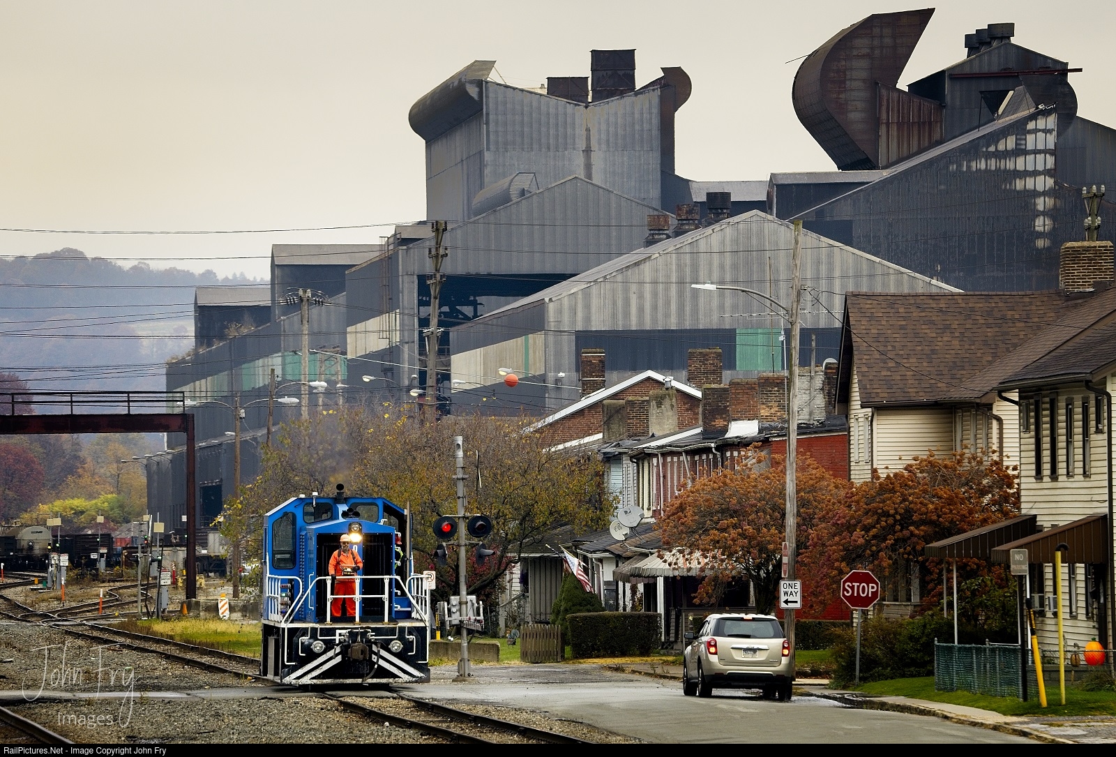| ATI 02 is returning to the Breckenridge plant after shuffling cars at the nearby Natrona facility. Allegheny Technologies, or ATI, has an operation that focuses on the production of stainless and specialty steels and is one of the few steel mills still in operation in the Pittsburgh area. Their mills in Natrona and Brackenridge are separated by about a mile of residential neighborhood. The small fleet of Republic RX500 locomotives handle all of the shuffling between them. |