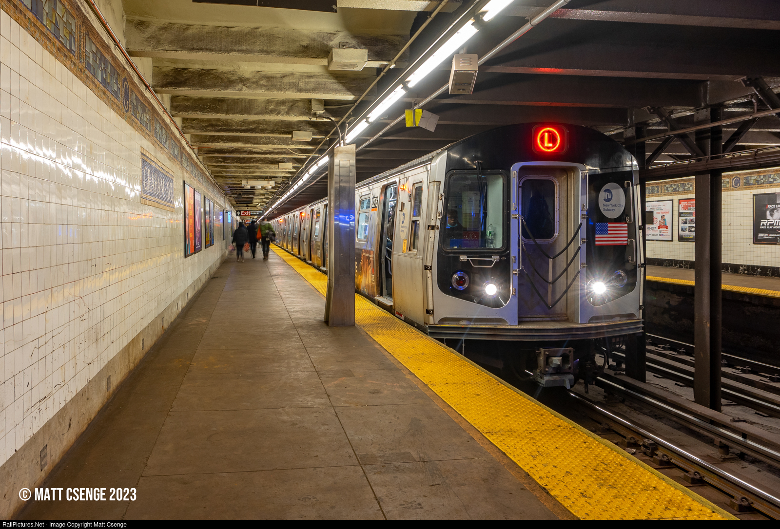 New York City Transit Authority (NYCTA) R143 no. 8276 (Kawasaki, 2001-2003) is the lead motor on a Canarsie-bound L train seen stopped at Graham Ave Station on the Canarsie Line.