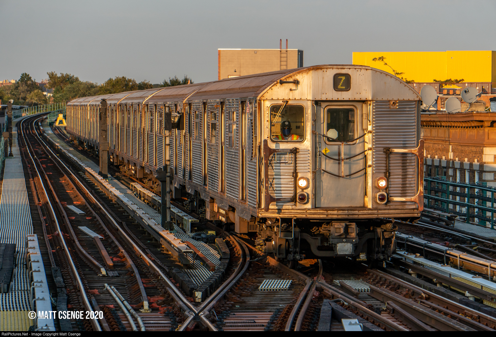 New York City Transit Authority (NYCTA) R32 no. 3404 (Budd, 1964-1965) is the lead motor on an out-of-service Z train seen pulling from the eastern pocket to the western pocket at 111th St Station on the BMT Jamaica Line for storage. Due to the configuration of the switches here, trains must enter the eastern pocket and reverse into the western pocket. |
