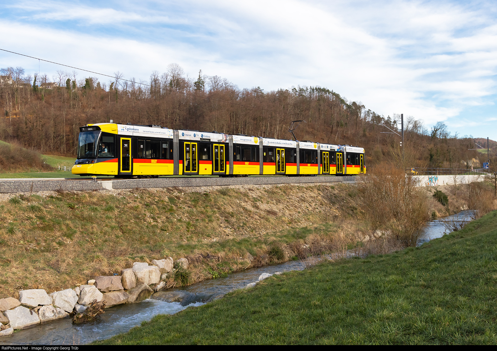 The 13-kilometer-long narrow-gauge railroad from Liestal to Waldenburg, the Waldenburgerbahn, was extensively renewed during about 1 1/2 years, converted from 75 cm gauge to meter gauge and equipped with 10 new streetcar vehicles from StadlerRail/Spain. The Waldenburgerbahn, now line 19 of the BLT (Baselland Transport) has been in operation again since the timetable change in December 2022 and runs every 1/4 hour during the day. The "Tramlink" streetcar Be 6/8 # 105 runs between Lampenberg-Ramlinsburg and Talhaus towards Liestal, along the renaturalized Frenke creek.