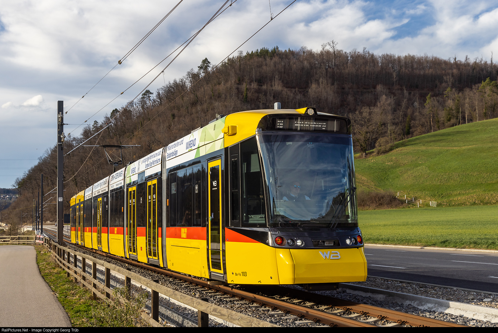 The 13-kilometer-long narrow-gauge railroad from Liestal to Waldenburg, the Waldenburgerbahn, was extensively renewed during about 1 1/2 years, converted from 75 cm gauge to meter gauge and equipped with 10 new streetcar vehicles from StadlerRail/Spain. The Waldenburgerbahn, now line 19 of the BLT (Baselland Transport) has been in operation again since the timetable change in December 2022 and runs every 1/4 hour during the day. The "Tramlink" streetcar Be 6/8 # 103 runs between Talhaus and Lampenberg-Ramlinsburg station towards Waldenburg..