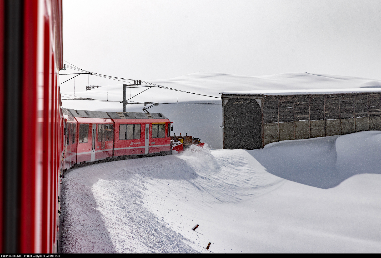 | In the event of fresh snow or strong winds, so-called track plows are put in front of individual scheduled passenger trains on the Bernina line of the Rhaetian Railway. The "Allegra" ABe 8/12 # 3515 is pulling train R 4621 from St.Moritz to Tirano and is just entering the 175 meter long Arlas snow protection gallery. In the driver's cab, in addition to the locomotive driver, there is an infrastructure employee who operates the lowering or raising of the track plow located in the middle of the vehicle via a remote control. This plow can eject snow or ice up to a few centimeters below rail level, but must be raised when driving over switches and grade crossings. The plows at the front and rear of the vehicle are fixed and not adjustable in height.