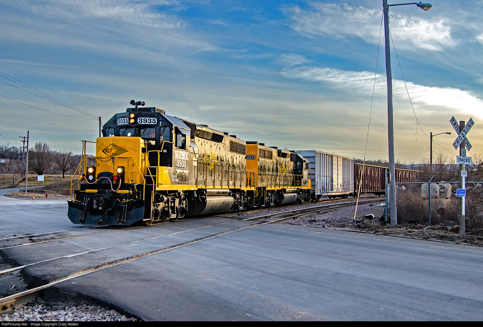 Kansas City Terminal Railway is a Class III terminal railroad, which operates 85 miles of track in the Kansas City metropolitan area. Operated by the Kaw River Railroad, the KCT no longer owns any locomotives, but instead leases them – with most wearing their logo, such as Webb Assett Management (WAMX) GP39-s 3935 and 3931, bringing a freight out of the KCT’s Mill Street Yard as the sun sets, heading for BNSF’s Argentine Yard. WAMX WAMX 3935 is ex-UP 2741, ex-UP 362, ex-UP 1241, ex-BM 362, née-DH 7602, while WAMX 3931 is ex-UP 1237, ex-UP 2737, ex-UP 358, ex-BM 358, née-DH 7618. (Kansas City, Kansas – March 3, 2016)