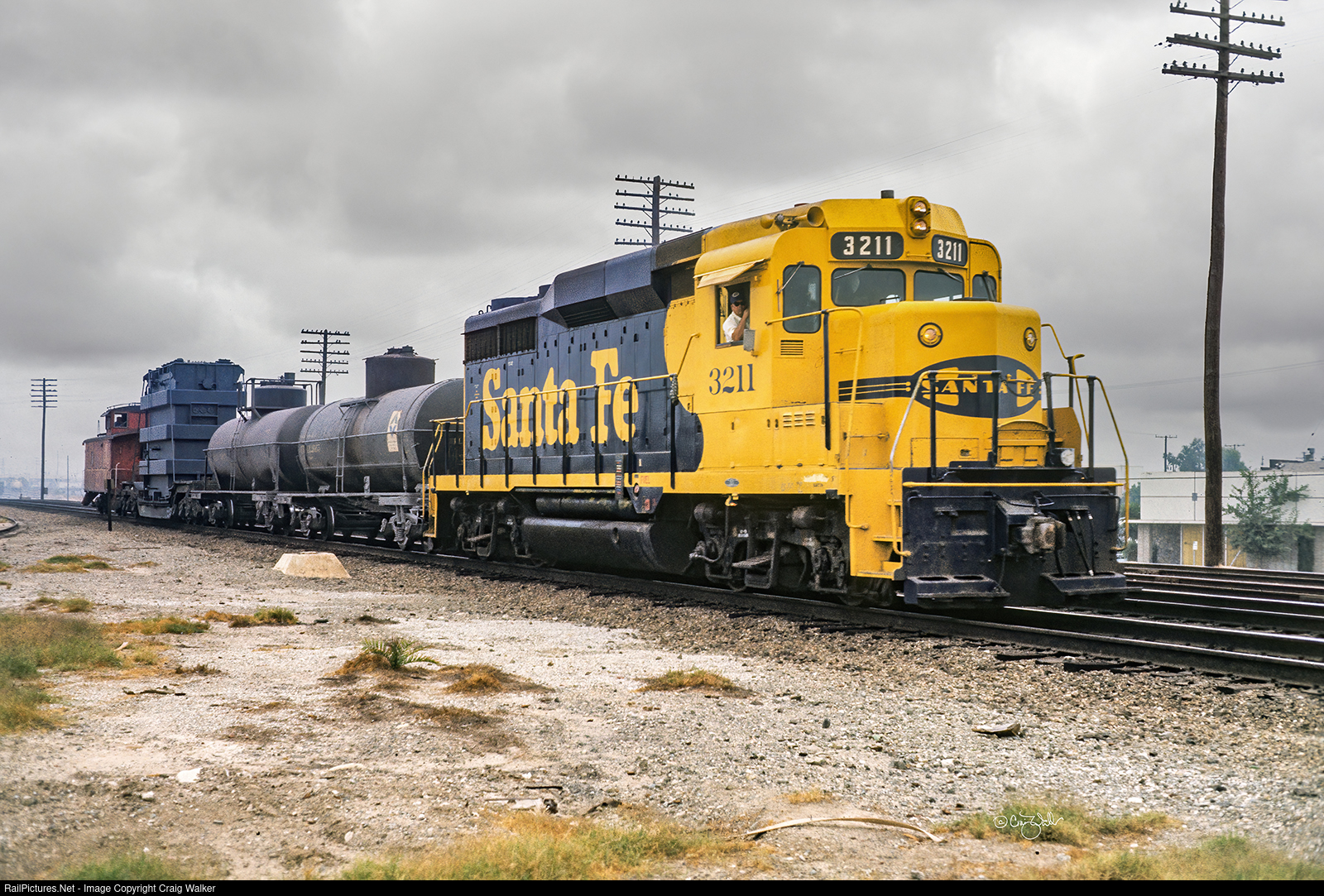 A high load on a depressed-center flat car is transported in a short Santa Fe train, led by GP303211 (ex-ATSF 1211). The two tank cars may be there as buffer cars. (La Mirada California – August 3, 1973)