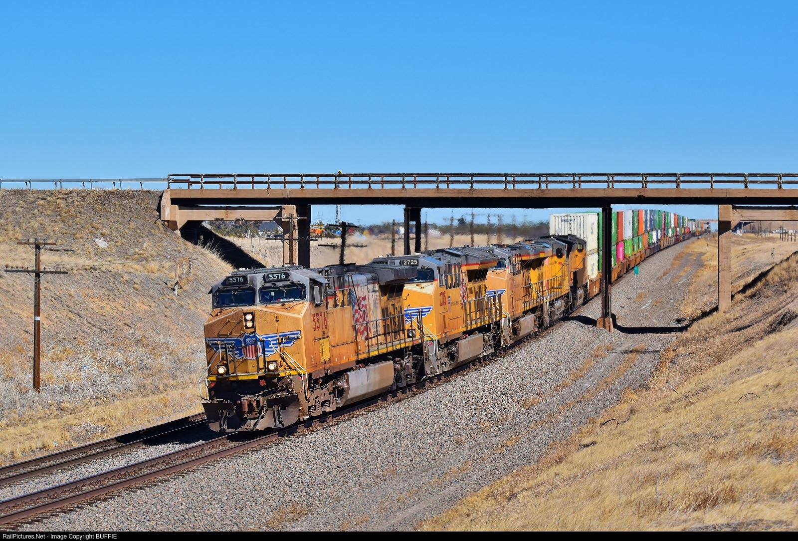 UP 5576 AC4400CW-CTE leads a stack train under the bridge at Archer Hill in Wyoming.