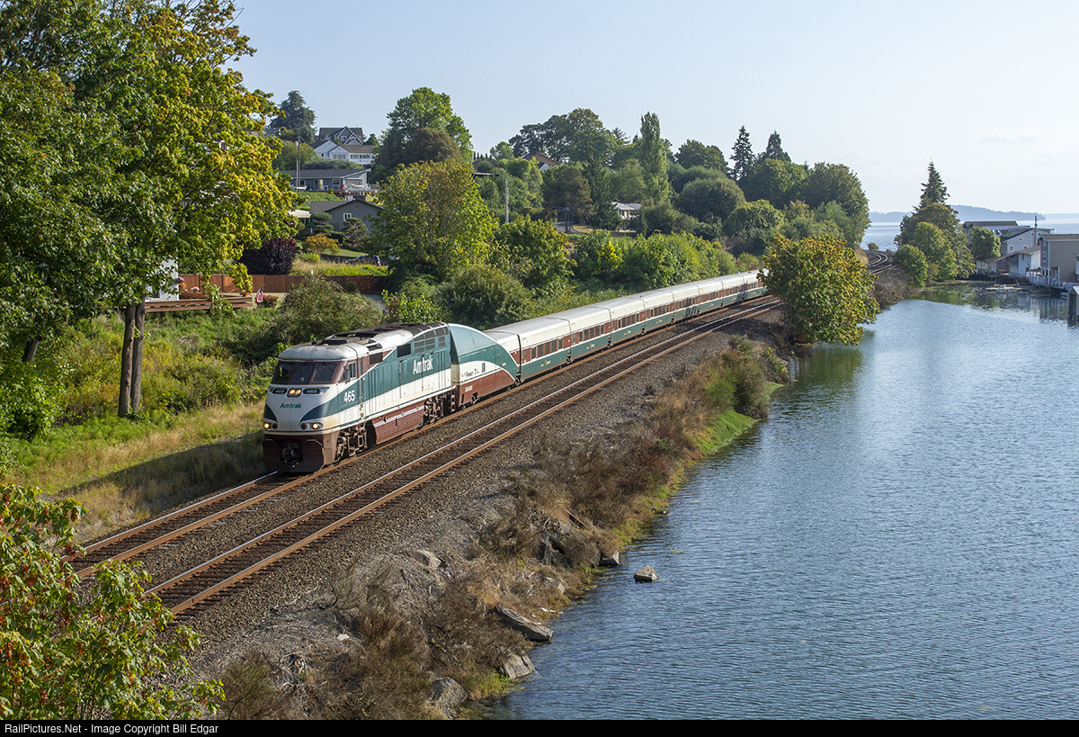 | AMTK 465 rushes an Amtrak Cascades service train north towards its stop at Tacoma. Passengers enjoy views of Puget Sound from Nisqually into Tacoma as the train glides past Days Island. Unfortunately Amtrak's new shortcut has eliminated the entire vista of Puget Sound from its Portland-Seattle routing. |