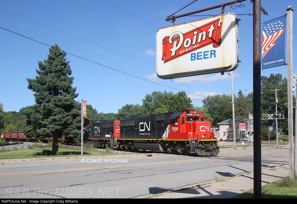 | Point Beer, a Wisconsin classic. This sign has changed alittle bit over the years, but it dates back to the MILW days. Here the Wisconsin Rapids job heads south on the Valley Sub heading back to Rapids with cars from the FOXY at Wausau and ballast out of Mosinee. |