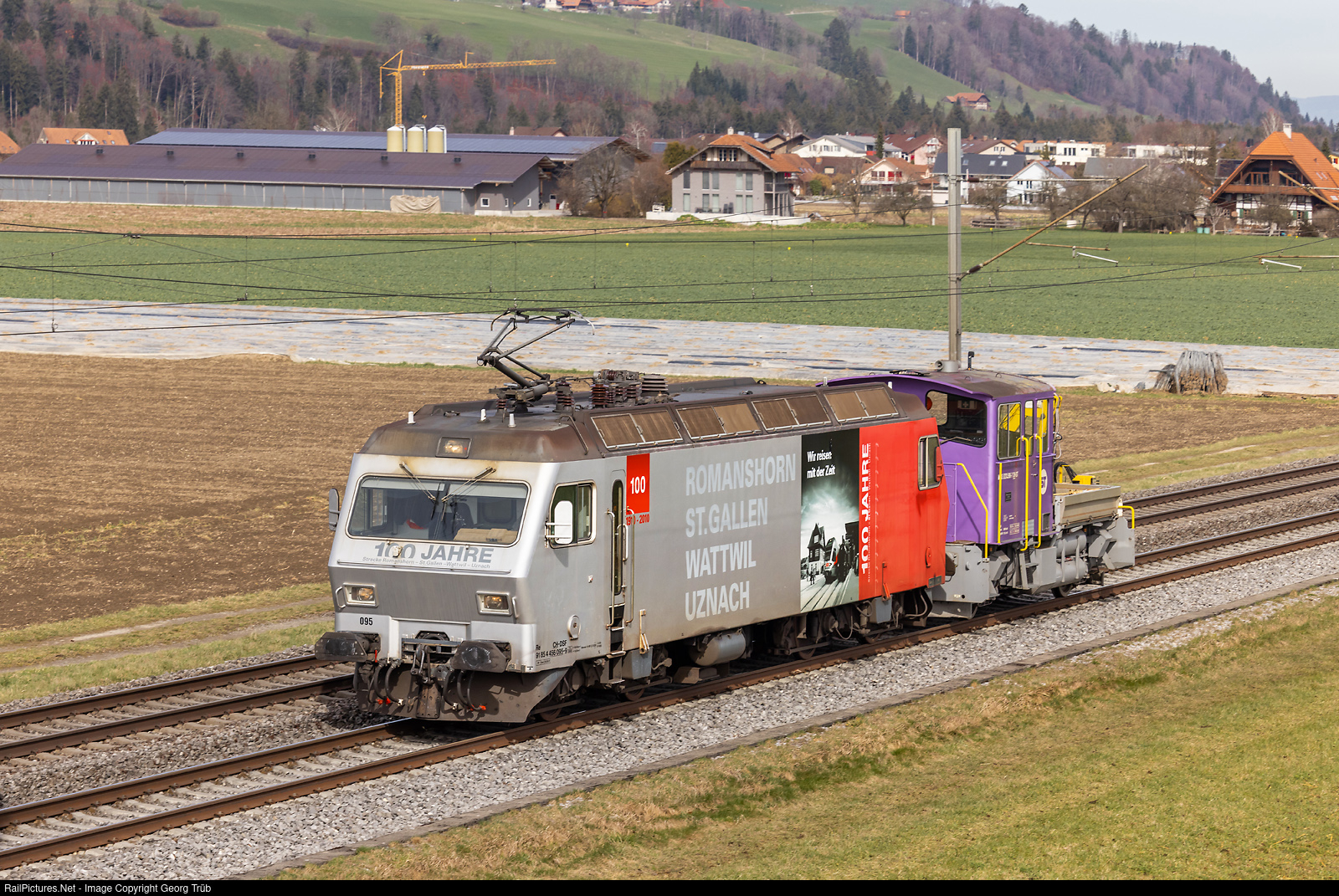 Re 456 # 095 of the DSF (Depot und Schienenfahrzeuge, Koblenz), former Bodensee-Toggenburg Bahn/Südostbahn, in the publicity paint scheme for 100 years railway line Romanshorn-St.Gallen-Wattwil-Uznach 1910-2010, is pulling the diesel shunter Tm 232 # 596 of the Sursee-Triengen Bahn (ST), as train 38020 from Sursee via Zofingen-Rothrist-Burgdorf-Zollikofen-Thun-Spiez to Interlaken Ost.
