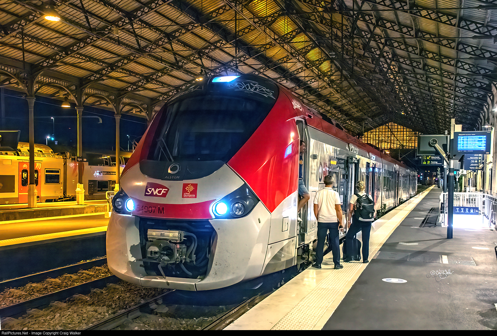 After pulling into the station in Agen, the engineer of a westbound Société nationale des chemins de fer français (SNCF) Intercités regional passenger train, led by an Alstom Z 54900 Régiolis (in this case, number 54907), has a chat with the station agent before departing eastward, back to where the train originated – most likely Toulouse. (Agen, France – September 11, 2022)