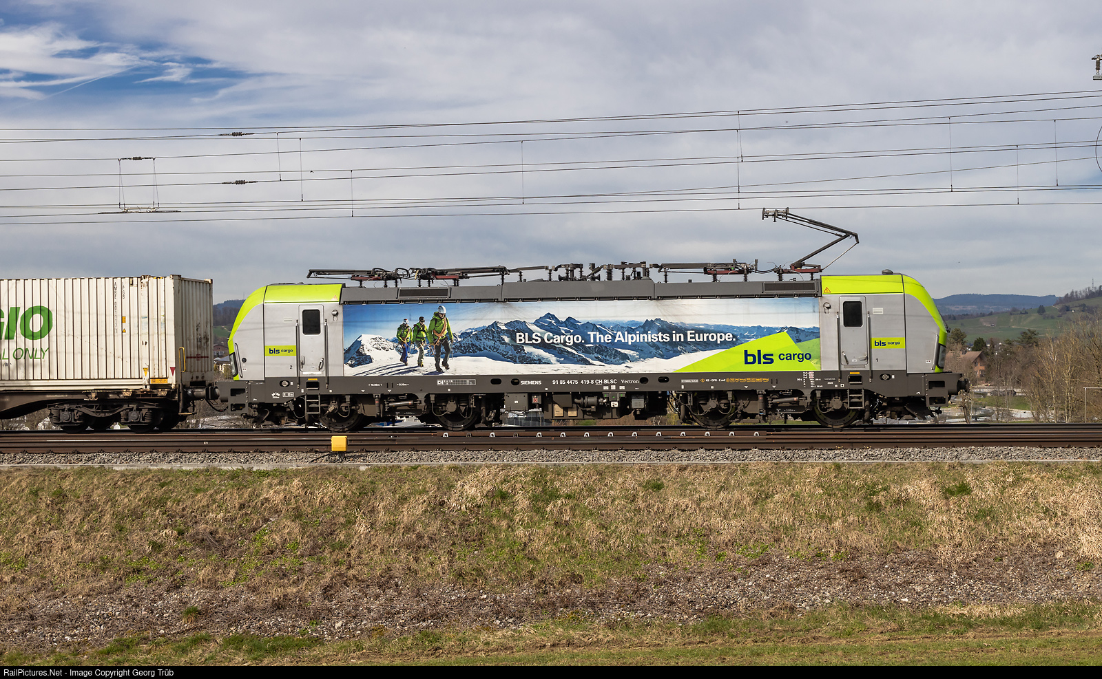 | Siemens "Vectron" Re 475 # 419 of the BLS Cargo is pulling the southbound intermodal train 40155 from Muizen/Belgium via Basel-Bözberg-Gotthard Base Tunne-Luino to Gallarate (Busto Arsizio Terminal)/Italy, between Frick and Hornussen. |