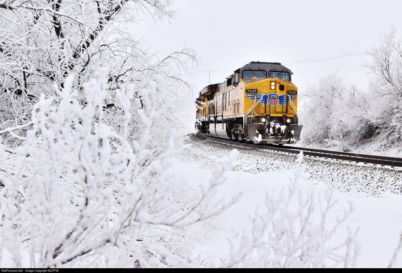 UP 7045 (C44ACM) leads a train through a very frosted Rocky, Colorado.