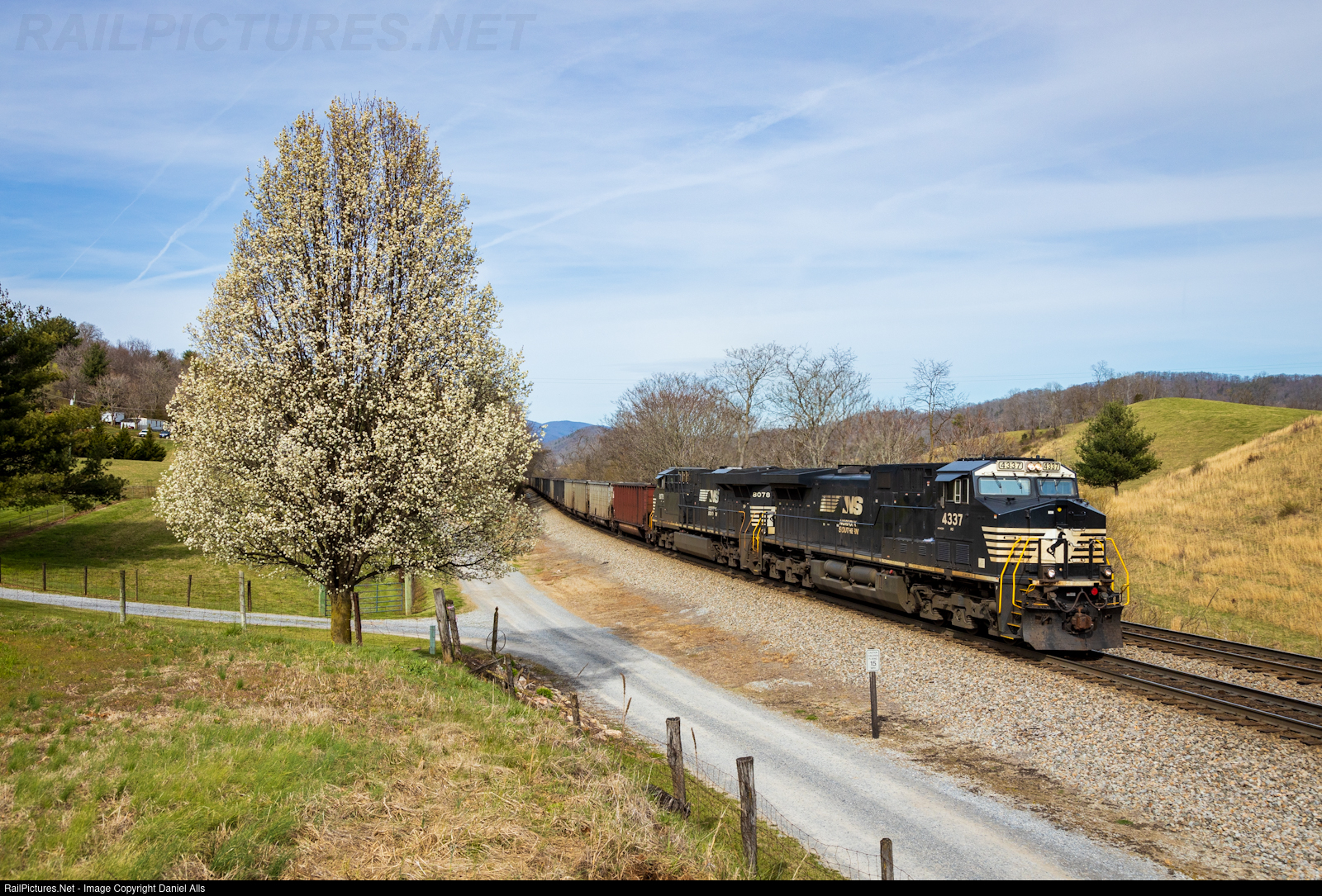 | An AC44C6M is in charge of an empty coal hopper train as it passes by a blooming Bradford Pear tree in Shawsville, VA. |