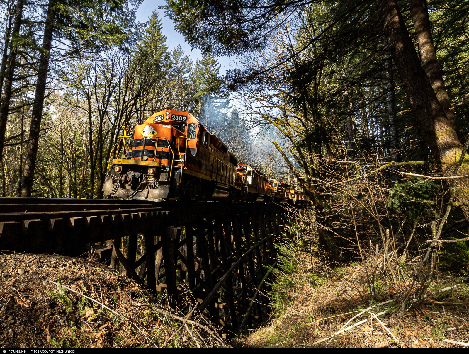On the morning of March 18th PNWR 2309 leads the Toledo Patch up the grade over the curved wooden trestle headed towards Summit, Oregon.
