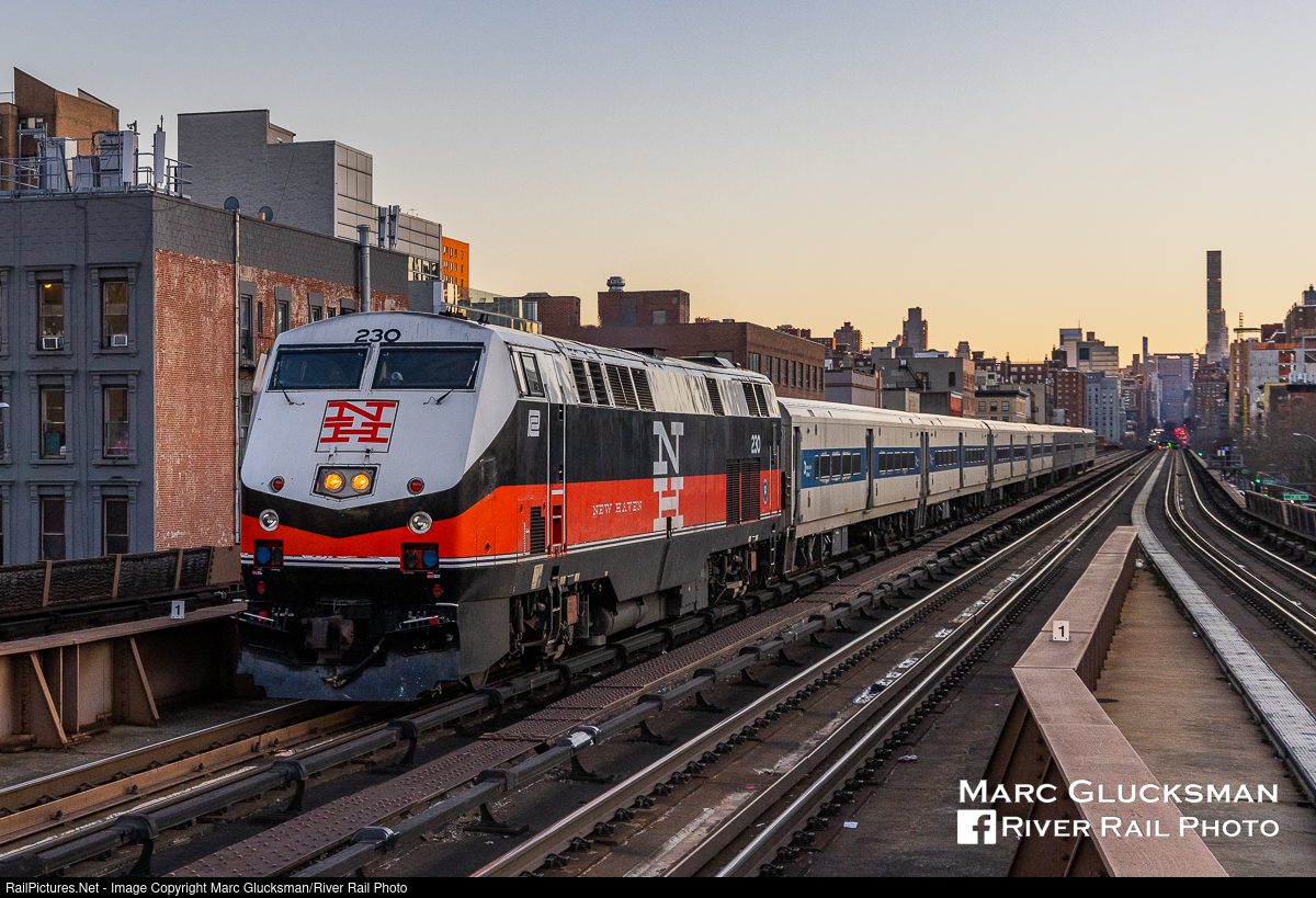 McGinnis And Mating Worms On The Viaduct. Looking down from the platform at Harlem-125 Street at sunset on Wednesday, March 15, 2023 brings Connecticut DOT/Metro-North Railroad 230 (P32AC-DM, New Haven Tribute) Metropolitan Transportation Authority Metro-North Railroad Train 8851 into view. The train has just departed Grand Central Terminal in New York, New York on the way to Poughkeepsie, New York. On February 1, 1968, the Penn Central Transportation Company was created and on December 31, 1968 the New York, New Haven and Hartford Railroad ceased to exist as an independent entity in the rail business when it was merged into the corporation. When NYNH&H joined PC, its assets were mixed and matched with the rest of the railroad, and most notable its FL-9s made their way on to the formerly New York Central Hudson and Harlem Lines to eliminate the need for an engine changes from diesel to electric to continue to New York City. While some units received a full repaint, others only had the new "mating worms" logo added to the existing scheme like this unit. The famous "McGinnis" paint scheme of the New Haven Railroad was actually designed by Harb Matter, but has been known by the name of the company's then president Patrick B. McGinnis. In 1976, Penn Central's failure led to the State Of New York and Conrail assuming responsibility for the commuter passenger operations on the Hudson Line, later ceding control to the Metro-North Railroad in 1983.