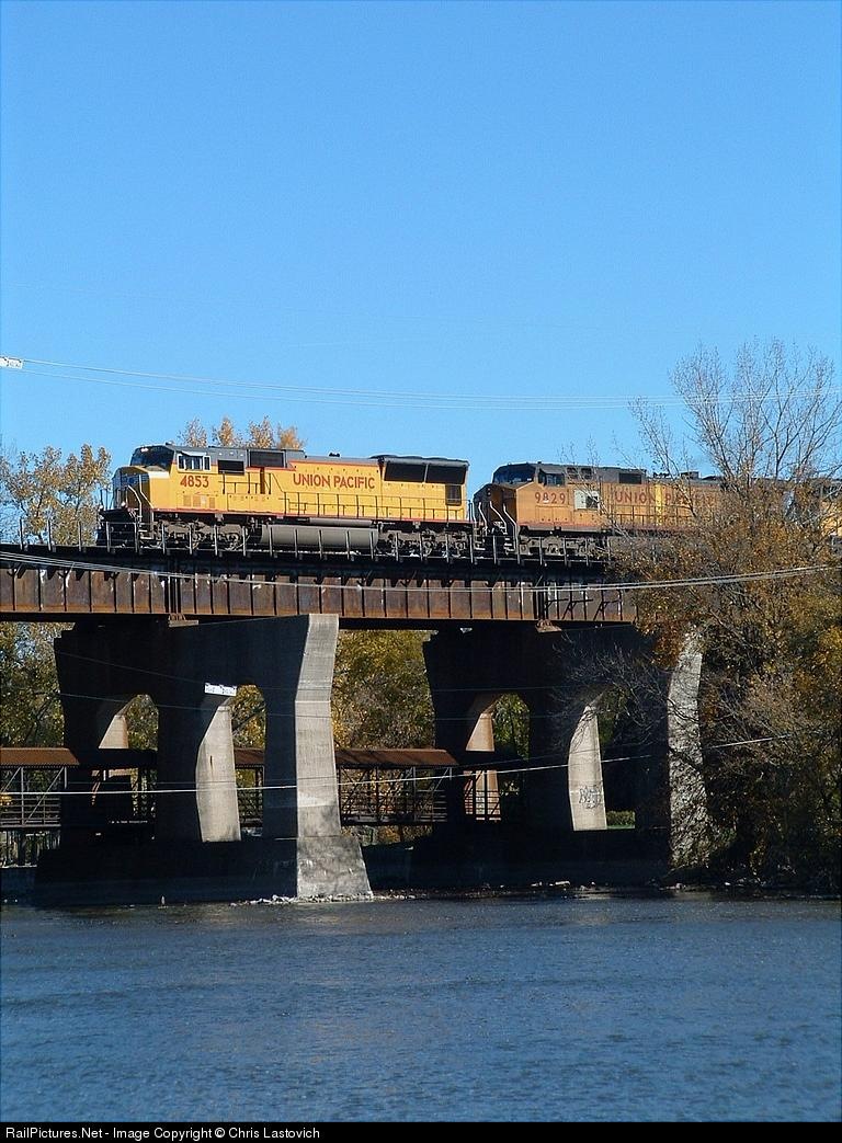 UP 4853 slowly crosses the Fox River. Patched CNW 9817 was 4th out in this consist.