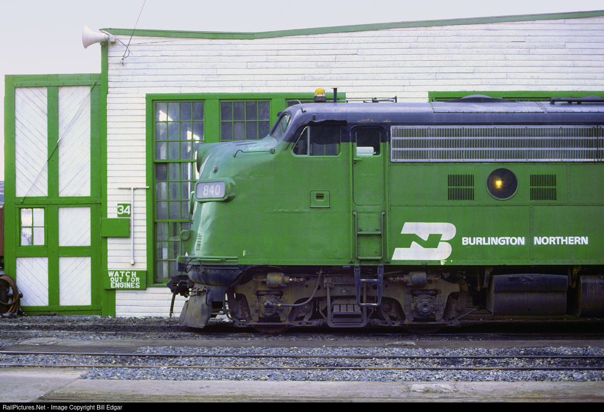 BN F9A no. 840 (Northern Pacific heritage) idles outside the wood engine house at Wishram, WA, the former SP&S crew change location between Pasco and Vancouver, WA. Immediately west of Wishram the Oregon Trunk line branches off and heads to California. The F units were common in freight service on various Washington state BN lines until the early 1980s.