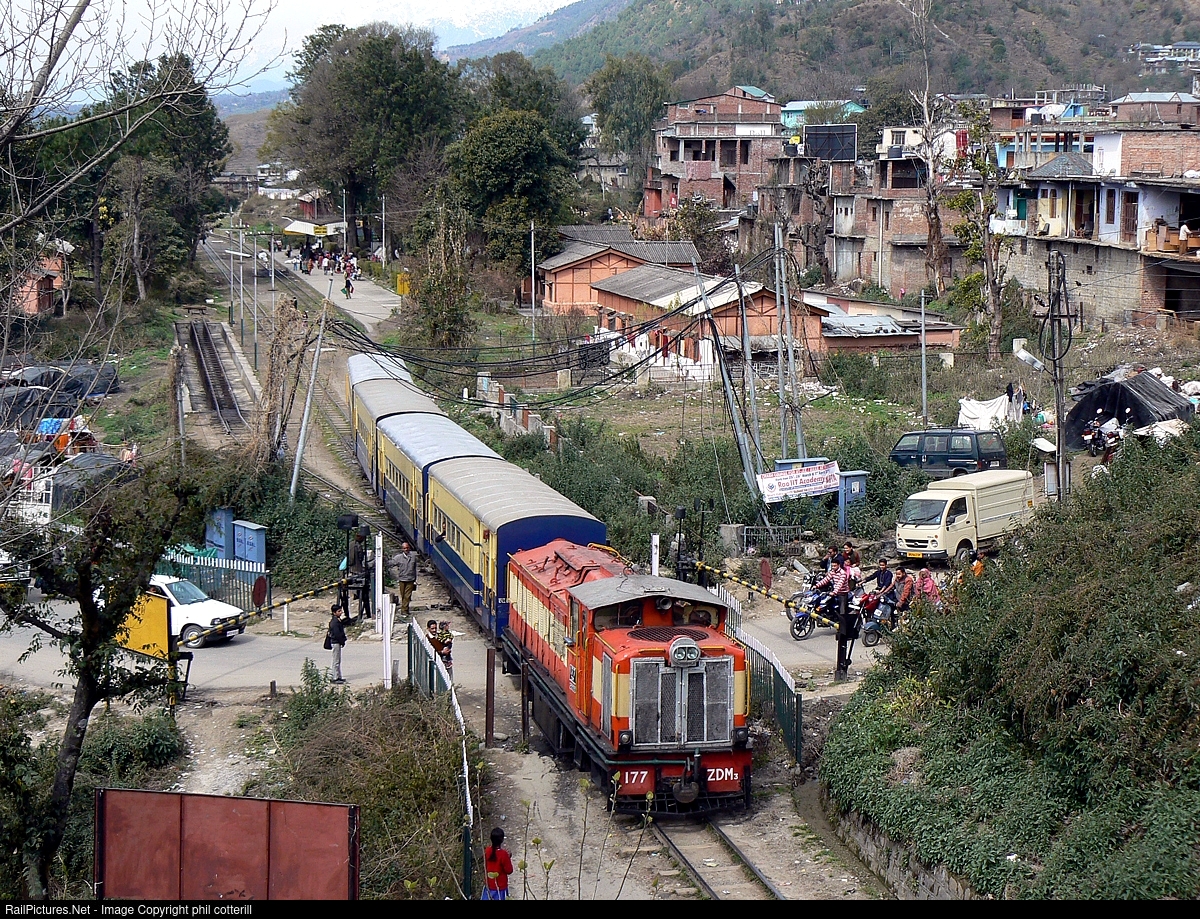 | Kangra Valley Railway, 2 feet 6 inch gauge ZDM3 No 177 shunts it`s train at Joginder Nagar, ready for the 101 miles return run to Pathankot. |