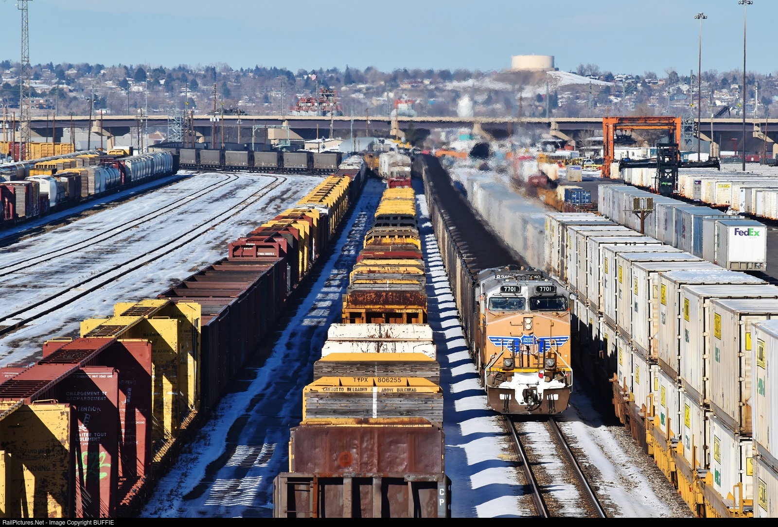 | UP 7701 (AC45CCTE) leads a coal train past the Union Pacific's North Yard and the BNSF's Intermodal Facility in Denver, Colorado.