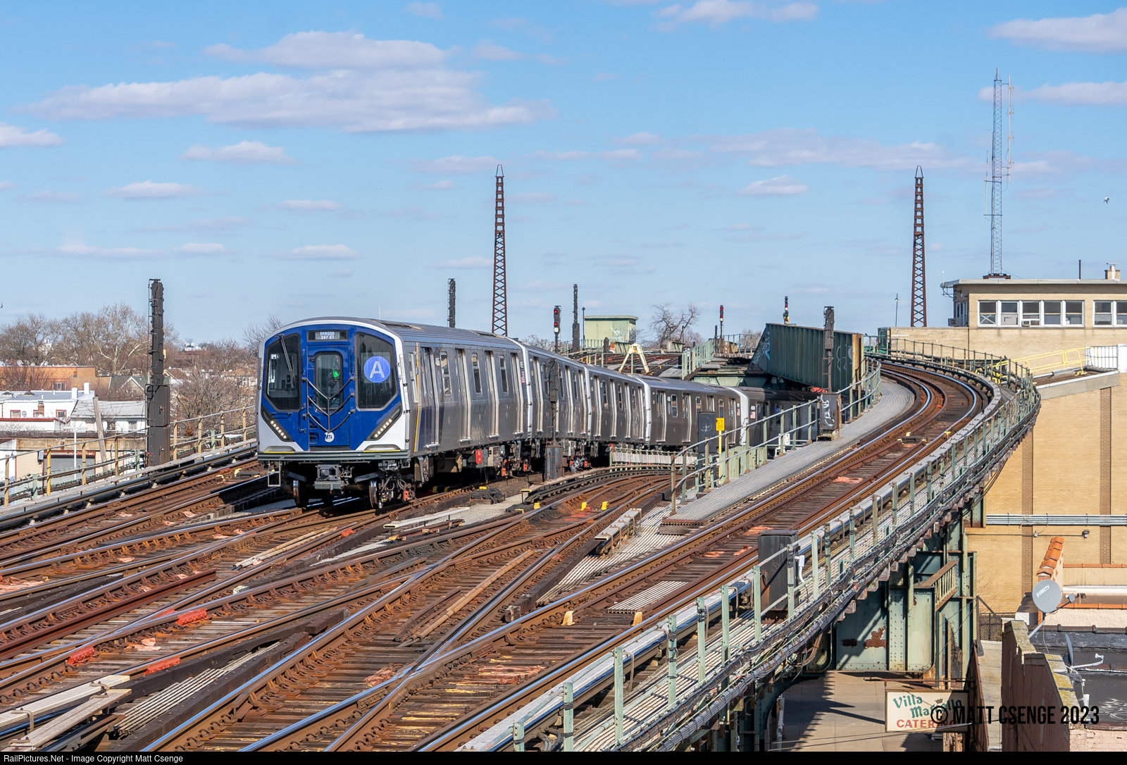 New York City Transit Authority (NYCTA) R211 no. 4065 (Kawasaki, 2019-present) is the lead motor on a Brooklyn-bound A train seen rising into the Liberty Avenue Line structure at Rockaway Blvd Station.