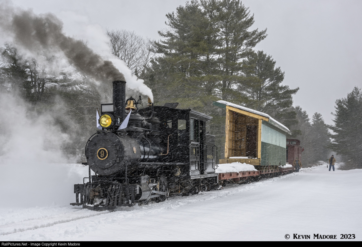 | Handle with care: A "high profile" load on the WW&F - Part 6. In a sudden snow squall, our freight extra stops at Alna Center Station to check the rigging on the load and take a few photos of this most unusual train. After checking the load over....and taking a few photographs of their own, Superintendent Jason Lamontagne heads forward to his post on Flat Car 118, while Conductor Dan Malkowski waits for everyone to get back on his train. It is time to take this load down the hill to Top of the Mountain Station. |