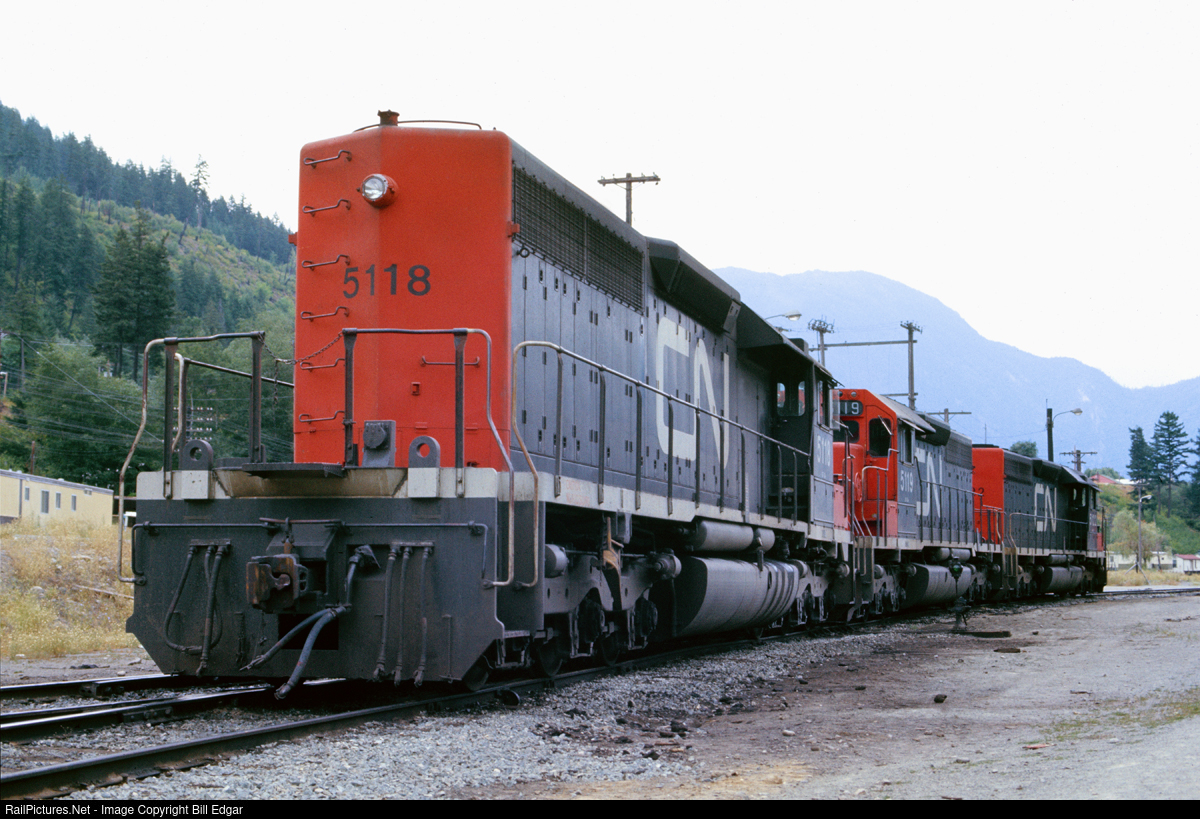 | This long hood view of a trio of CN SD40s at Boston Bar show off the Canadian road unit style rear headlight treatment. Note no class lights or number boards as well. This particular trio is dynamic brake equipped and were intended for unit coal and sulfur train service. Many CN SD40s were non-dynamic brake, and some had vertical twin sealed beam headhlights, as well as class lights and number boards. |