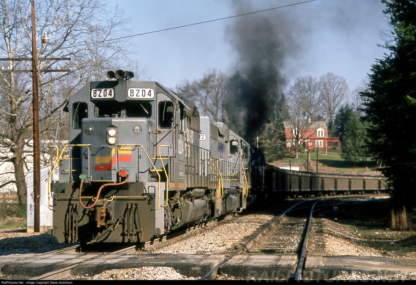 8204, still in Seaboard System livery, leads an empty hopper train north at Marion North Carolina on the former Clinchfield RR. 8204 was former L&N 3576.