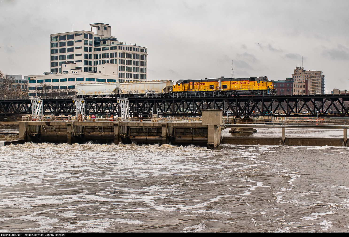 | On a windy and frigid cold morning, UP’s KD Local crosses the Rock River with two GP15-1’s and two interchange cars from the IR to take back to Belvedere. The conductor rides the head end over the bridge, as they prepare to drop the IR cars at the KD Line connection while they head down the KD Line light to pickup 5 cars from Cimco in Loves Park, and eventually take all 7 cars back to Belvedere. |